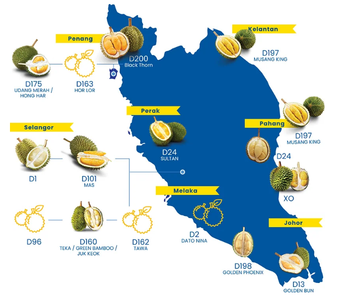 在馬來西亞,大約有200個榴蓮品種有自己獨特的風味和香氣。同時它們也對適宜的生長條件也特定的需要,例如降雨,海拔,溫度和土壤結(jié)構。榴蓮僅在成熟季節(jié)才有供應那發(fā)生在每年的六月和七月。那個時節(jié)成熟后從樹上自然掉落的榴蓮,往往會含有較多的果肉和更濃郁的香氣。